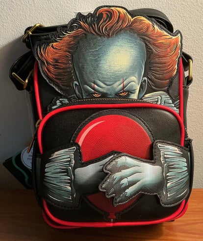 You KNOW you needed Pennywise as a Crossbuddies bag! Everyone's favorite dancing clown appears in applique detail on the bag. His arms reach around to hug the removable, reversible coin bag. One side of the coin bag features a red balloon and the other side features Georgie's boat. On the back of the bag, you'll find Pennywise's signature phrase, "Time to Float." It's a versatile accessory that's perfect for all your spooky season outings! This is a faux leather crossbody bag that features an adjustable crossbody strap, a detachable and reversible coin bag, an applique, debossed and printed details with a coordinating interior lining. Ages 17 and up.