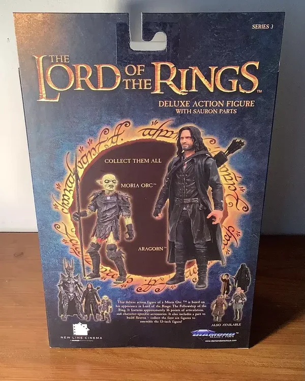 The Evil one has risen! Complete your 13-inch build-a-figure of Sauron with this, the third series of Lord of the Rings Deluxe action figures! Aragorn and a Moria Orc are the two figures in this series, each with weapons and accessories - the orc even includes alternate heads so you can customize different orcs! Each 7-inch scale action figure features multiple points of articulation, as well as detailed sculpting and paint applications. Each figure comes packaged in a full-color Deluxe window box.
