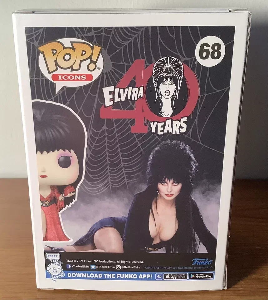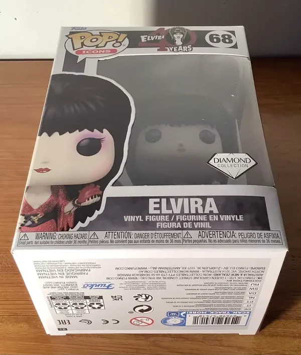 This Elvira 40th Anniversary Diamond Glitter Pop! Vinyl Figure measures approximately 3 3/4-inches tall. Comes packaged in a window display box. Ages 3 & up