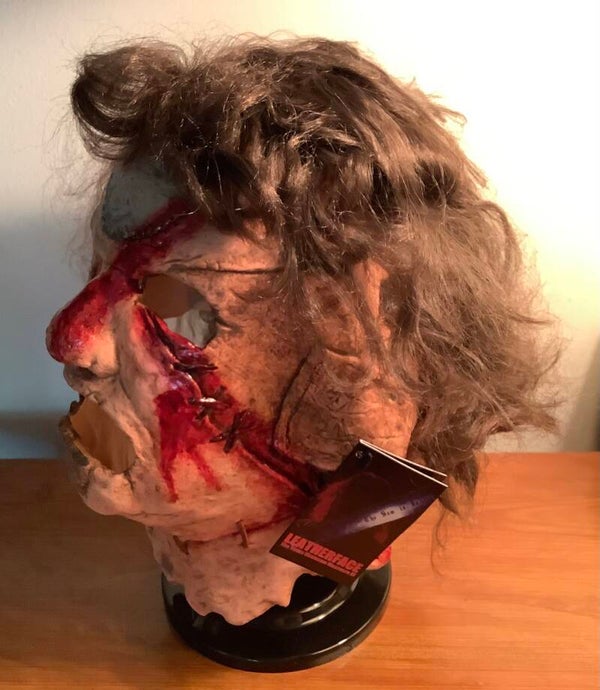 Complete your costume or Halloween horror collection with Leatherface! Sculpted with every detail of Leatherface, portrayed by R. A. Mihailoff, this amazing full-head mask includesthe tattoo on his cheek! A highly detailed replica of the mask worn in the horror sequel, Leatherface: The Texas Chainsaw Massacre III! Every detail of Leatherface is captured in this amazing latex mask. Order this chilling mask and stalk your neighborhood this Halloween Night! Ages 17 and up. [3]