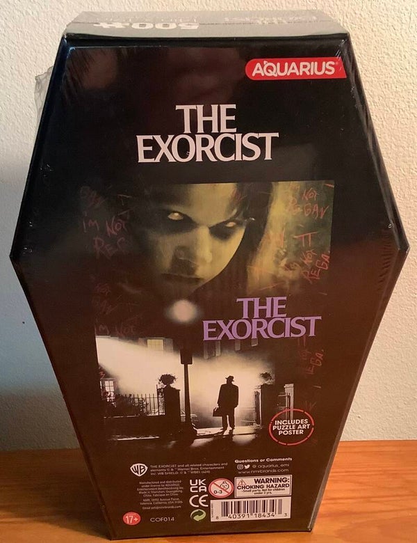 Face your fears and assemble The Exorcist Coffin Box 500-Piece Jigsaw Puzzle! With 500-pieces to put together, this horror puzzle measures approximately 19-inches tall x 14-inches wide when complete. Best of all, it comes packaged in a spooky coffin shaped box! Ages 17 and up.