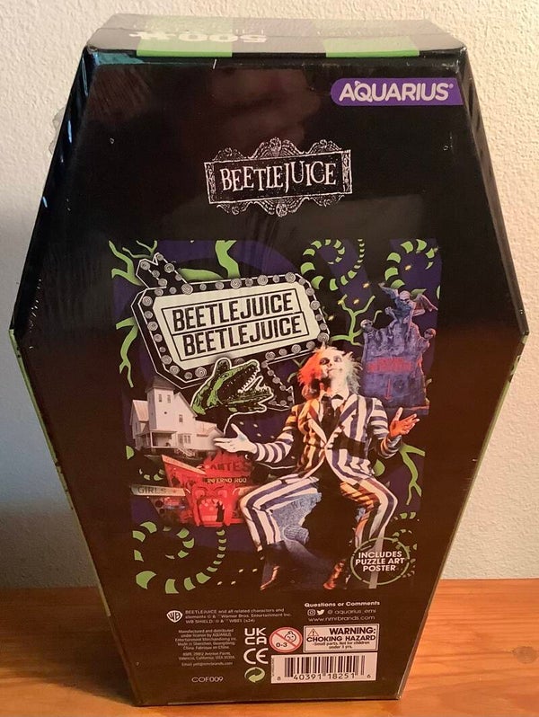 Face your fears and assemble this Beetlejuice Coffin Box 500-Piece Jigsaw Puzzle! With 500-pieces to put together, this horror puzzle measures approximately 19-inches tall x 14-inches wide when complete. Best of all, it comes packaged in a spooky coffin shaped box! Ages 17 and up.