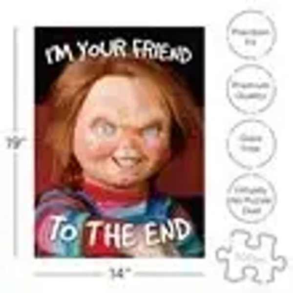 Face your fears and assemble this Child's Play Chucky Coffin Box 500-Piece Jigsaw Puzzle! With 500-pieces to put together, this horror puzzle measures approximately 19-inches tall x 14-inches wide when complete. Best of all, it comes packaged in a spooky coffin shaped box! Ages 17 and up
