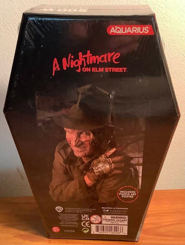 Face your fears and assemble this A Nightmare on Elm Street Coffin Box 500-Piece Jigsaw Puzzle! With 500-pieces to put together, this horror puzzle measures approximately 19-inches tall x 14-inches wide when complete. Best of all, it comes packaged in a spooky coffin shaped box! Ages 17 and up.