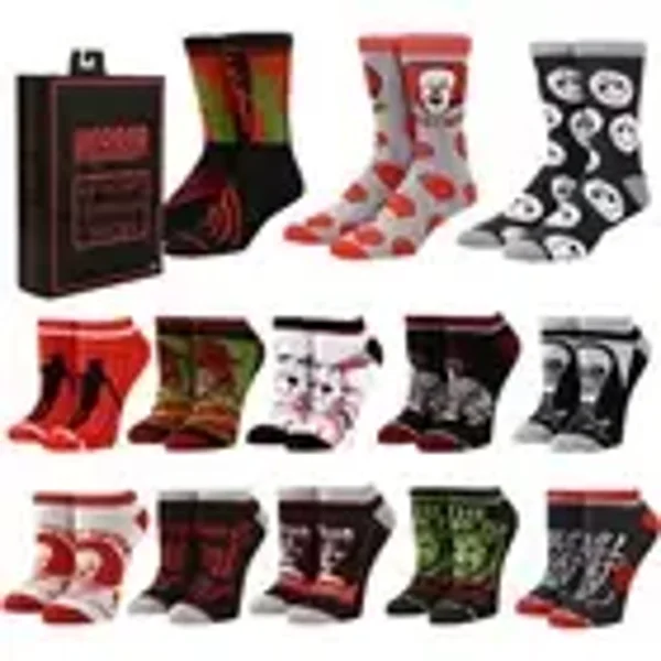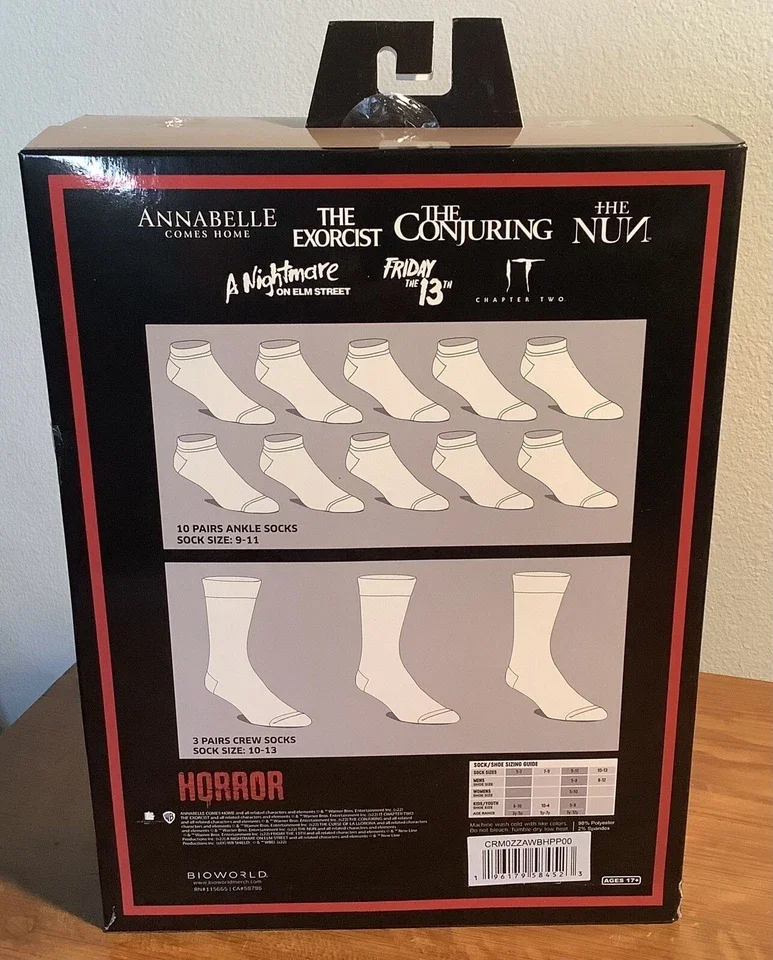 Show off your horror movie fandom with this Horror Icons 13 Days of Scary Socks Box Set! It includes 10-pair ankle socks, and 3-pair crew socks. Sizing: Fits shoe sizes 8-12. Care: Machine wash cold with like colors, do not bleach, tumble dry with low heat. Ages 17 and up.