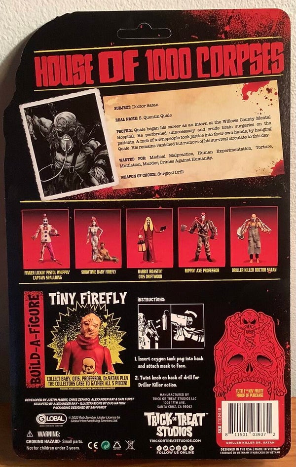 Your horror collection is about to level up! House of 1000 Corpses 5-Inch Action Figure Case includes 12x individually carded 5-inch action figures from the popular House of 1000 Corpses. Each figure includes fun accessories and a build-a-figure piece to build Tiny Firelfy! Ages 17 and up.