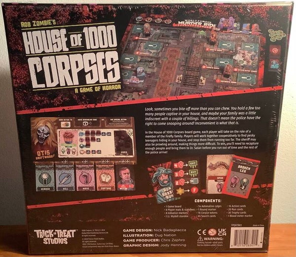 Howdy Folks! Do you like blood? Violence? Freaks of nature? Well, then boy do we have something for you! Gather your friends and family and enjoy the Rob Zombies House of 1000 Corpses: A Game of Horror Board Game for your next game night! Play the part of the Firefly family, working together to round up some pesky kids who are running around your house! To win, you'll need to bring enough of them to Dr. Satan before the police show up! Have a thrilling time and order yours, today! Approximately 60 minutes of game play. Perfect for 1-4 players, ages 17 years and up.
