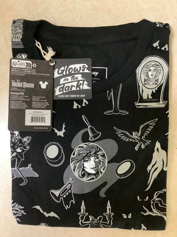 Fans of Disney's The Haunted Mansion are sure to love this themed T-Shirt! The 100-percent cotton jersey tee features a roller printed design that glows in the dark! Sizes run from Adult Large to Adult XXX-Large. For ages 15 and up.